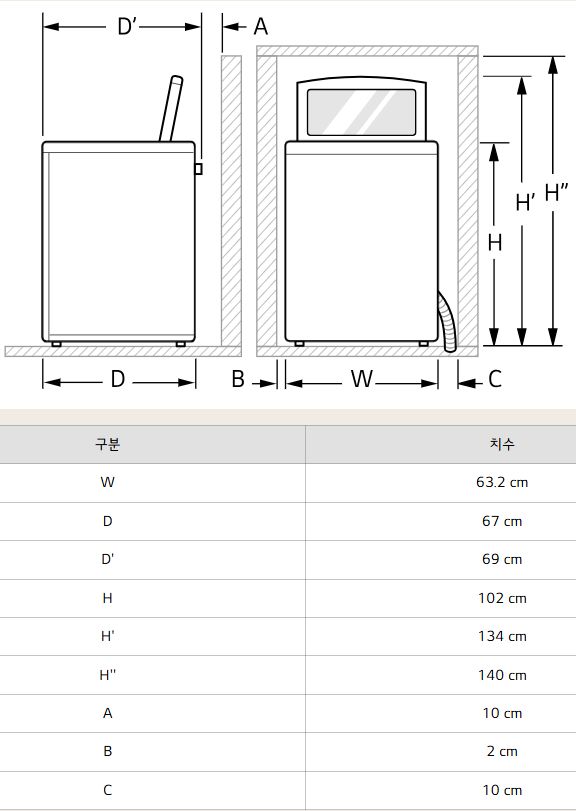 크기 WHD는 632x1018x670 mm 인데, 뒤로는 급수구 연결부분이 2cm정도 더 튀어나와있습니다. 따라서 여기에 급수관을 연결해야 하므로, ㄱ자형 끝을 연결한다 해도 실제 필요한 깊이(depth)는 약 75cm 근처일 것 같네요. 그리고 왼쪽으로는 2cm만 필요하지만 오른쪽은 배수관이 나와야 해서 10cm가 필요하다고 합니다.