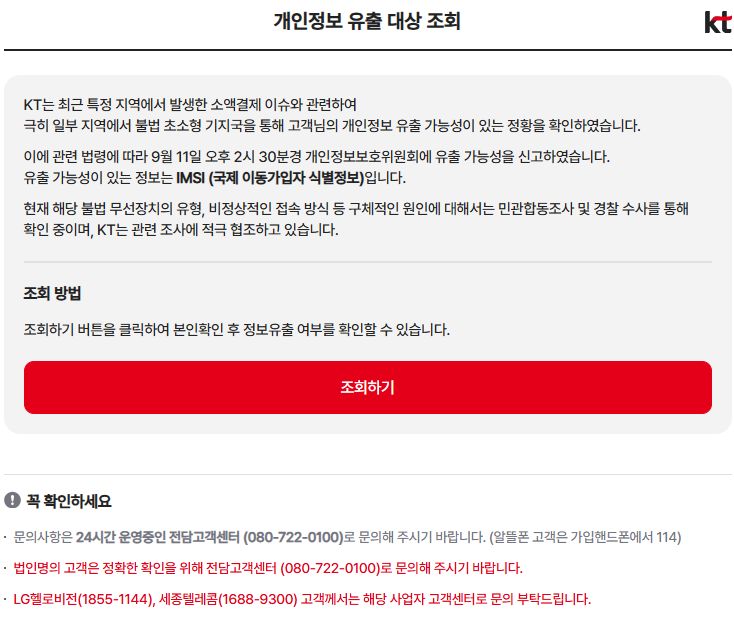 KT는 최근 특정 지역에서 발생한 소액결제 이슈와 관련하여, 2025년 9월 8일 일부 지역에서 불법 초소형 기지국을 통한 고객님의 개인정보 유출 가능성이 있는 정황을 확인하였습니다.