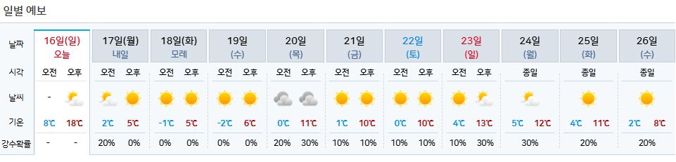 2025.11.16.일.~11.26.수. 늦가을 날씨. 최저기온 0~영하2도 본문
