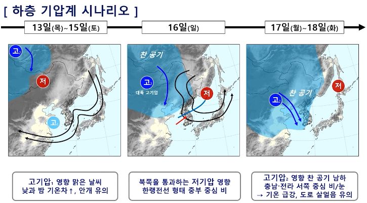 기온이 곤두박질. 월요일부터 영하권 추위. 서쪽지역과 제주도는 첫 눈! (2025년 11월 13일 기상청 예보브리핑)