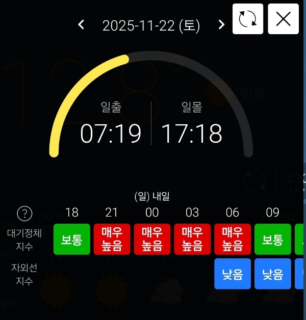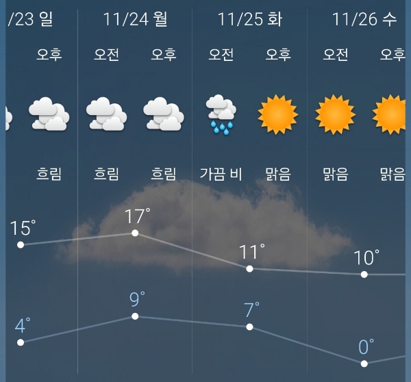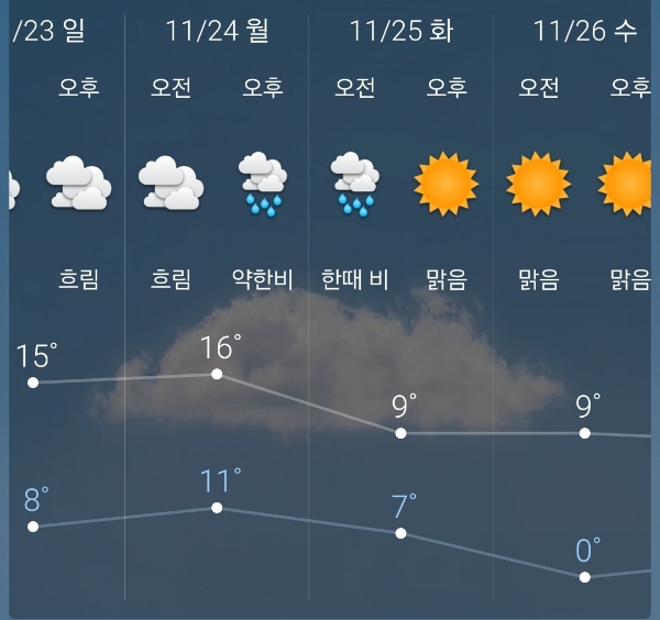 | 2025.11.16.일.~11.26.수. 늦가을 날씨. 최저기온 0~영하2도 (0) | 2025.11.16 |