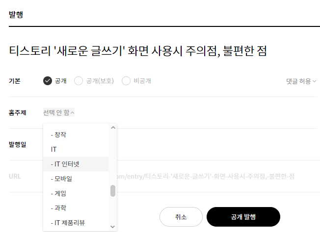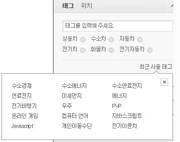 구편집기와 마찬가지로, 새로운 글쓰기 역시 태그입력창에 자동완성기능을 지원하지 않는 문제가 있습니다. 자동완성을 지원하지 않을 뿐 아니라 최근사용태그 예시도 없습니다.