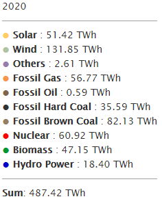 전체적으로는, 작년인 2020년 태양광+풍력+바이오매스+수력의 생산량 합계가 가스+석탄+원자력을 넘었다.