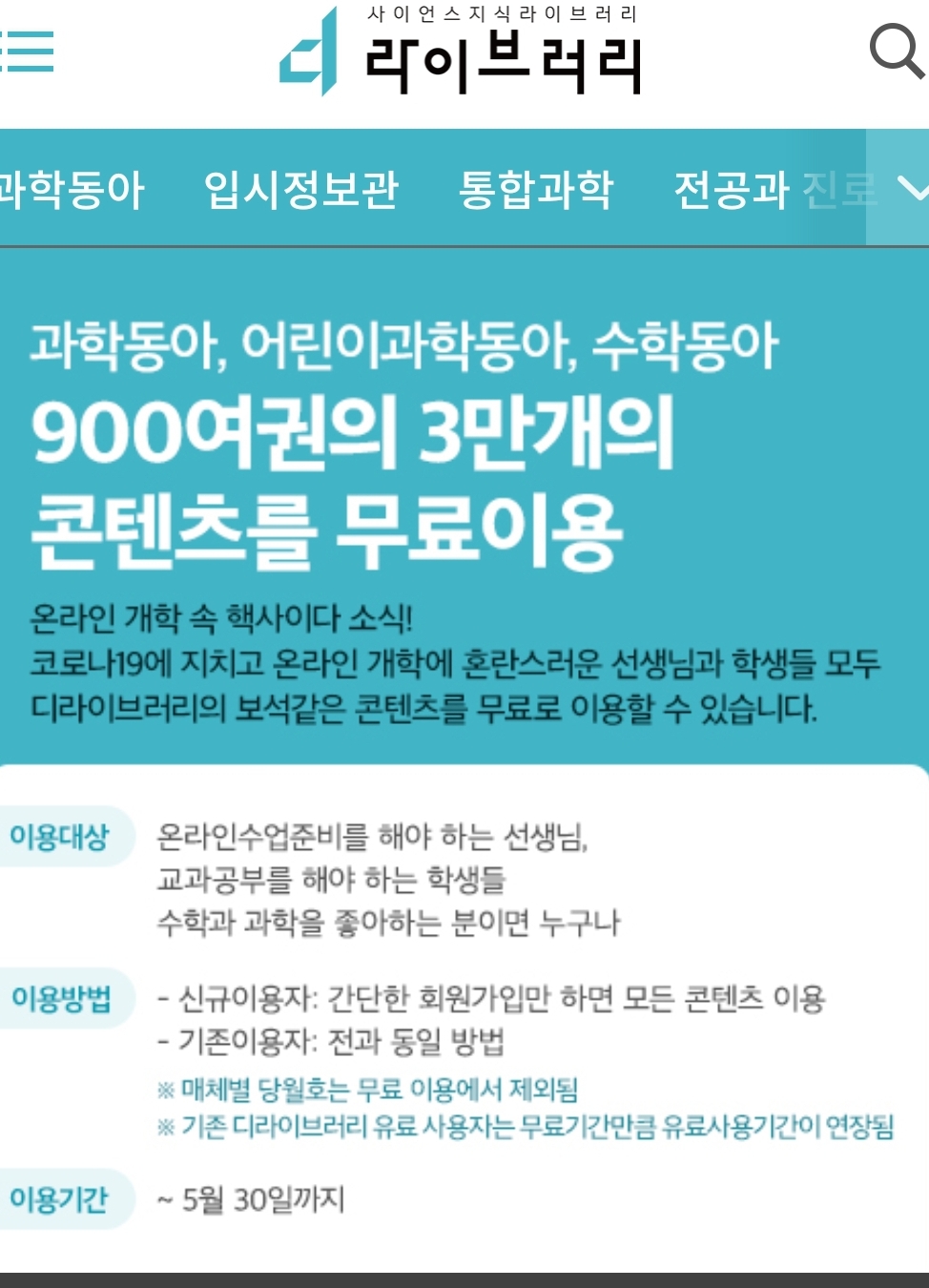 초중고 온라인 학습과 사회적 거리두기(feat.방콕, not game) 취지라고. 대상은 초중고교생과 교사라는데, 일반공개입니다. 단, 당월호(최신호)제외, 무료회원가입필요, 기존 구독자에게는 그만큼 구독기간 연장.