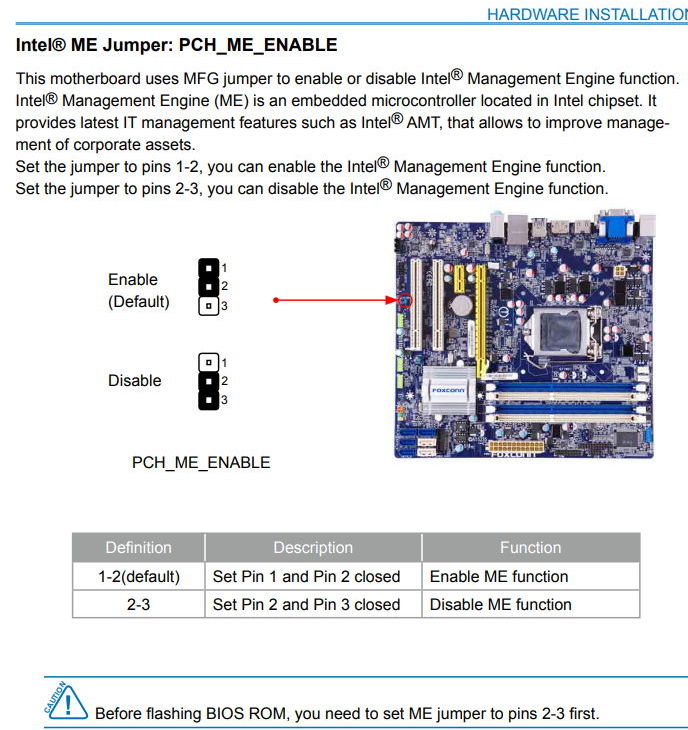 점퍼 세팅: CMOS 지우기, 인텔 ME 끄기