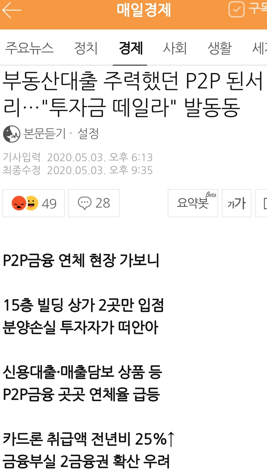 위기의 저신용자…P2P 연체 급증 - 매경 2020.5.3