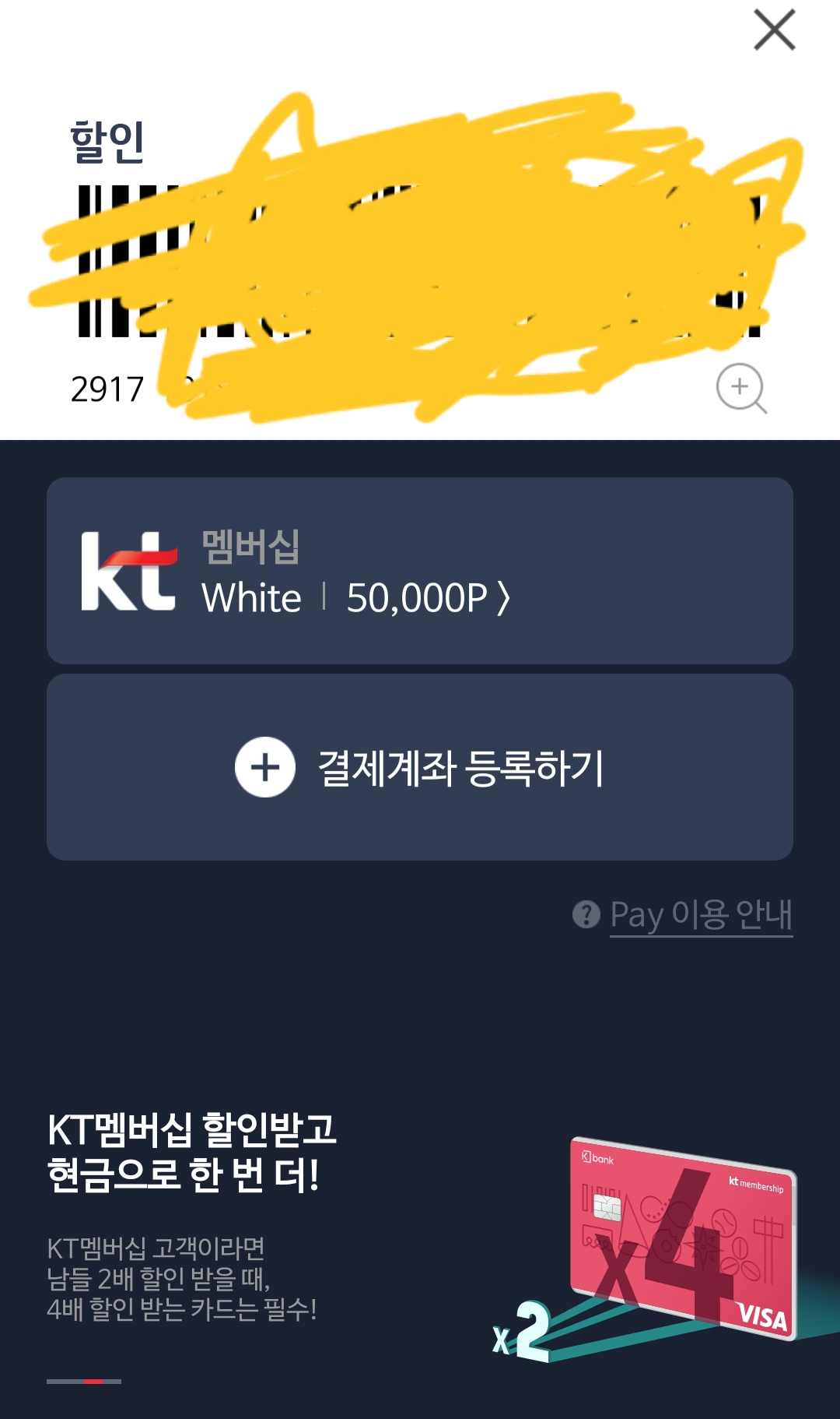 kt의 모바일상품(휴대폰요금제 등 앱설치되는 이동전화번호가 있는 요금제)에 가입해 있지 않더라도3, kt의 유선인터넷상품4에 가입해 있고 장기가입자라면 멤버십포인트가 충전돼있을 수 있다. 그럼 모바일카드를 발급신청하고 앱을 깔아 제휴사에서 할인받는 데 쓸 수 있다.