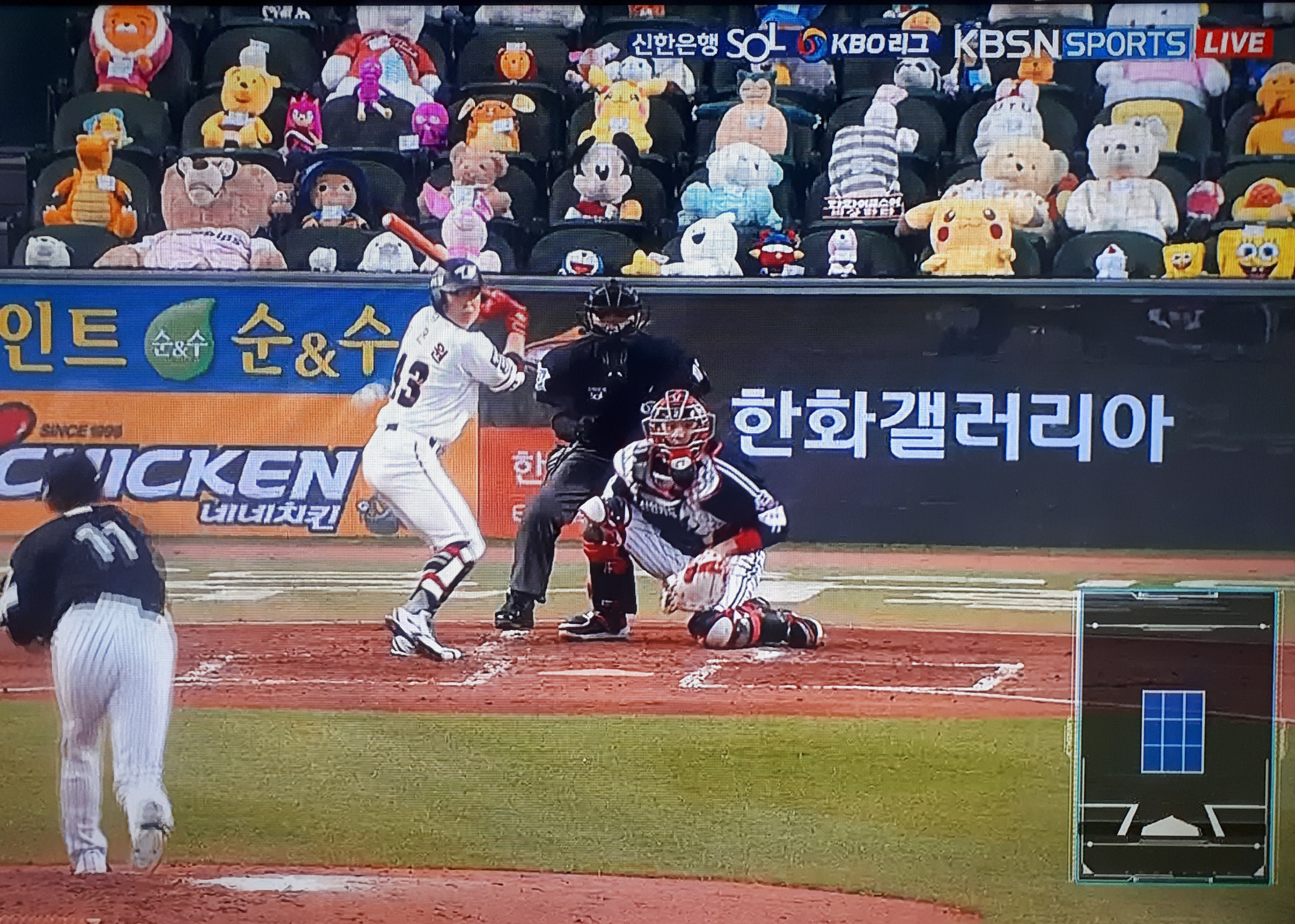 ※ 포수 뒤 펜스를 겸한 광고간판 화면을 좀 개선해야겠더군요(전원이 안 좋나?). 아니면 촬영하는 카메라 모드(?)를 좀 바꾸거나. 일반 화면에서는 아무 문제없는데, 투구장면을 슬로우모션으로 보여줄 때 그 간판에서 넓은 면적에 플리커링같이 노이즈가 번쩍번쩍 보여 좀 그랬습니다.