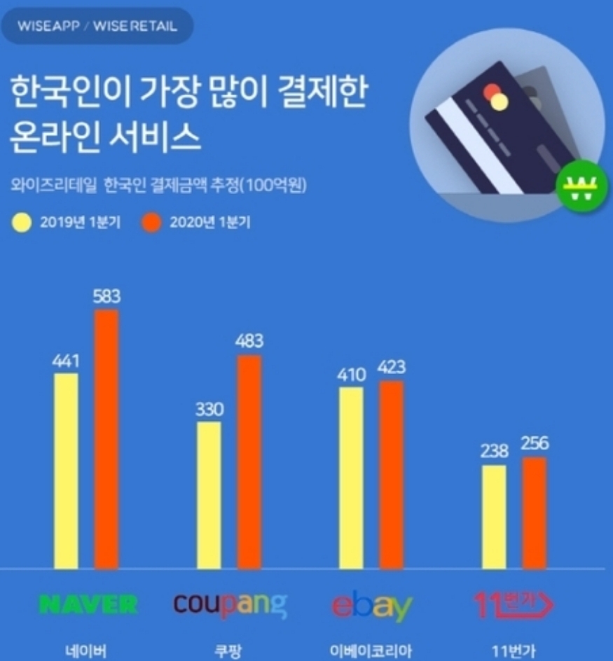: 앱·리테일 분석서비스 와이즈앱·와이즈리테일, ‘주요 온라인 플랫폼 1분기 추정 결제금액’(2020)
