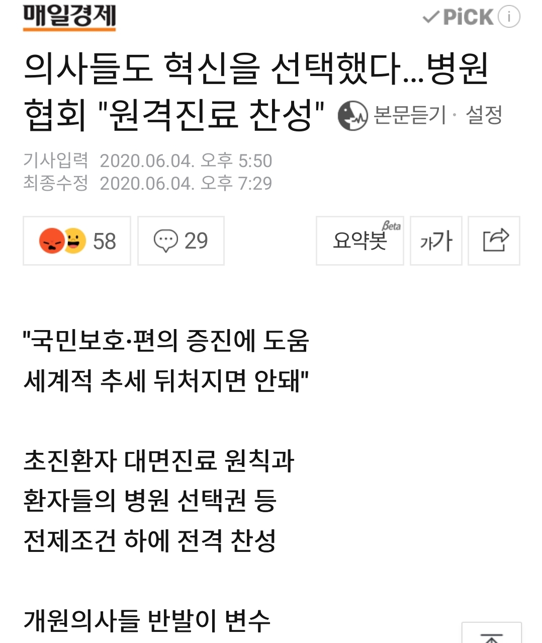 기사에서는 원격의료의 필요성을 몇 가지 말하고 있는데, 한편 다른 자동화, 비대면화된 일처리처럼, 이것도 기술이 발전하고 일처리 경험이 어느정도 쌓이기까지 환자 입장에서 잃는 것도 분명 있을 것 같습니다. 예를 들어 지역 의원에서 피뽑아 택배보내고 화상통화로 주치의를 3분 볼 때(그런 방식이 허용된다면 말입니다).
