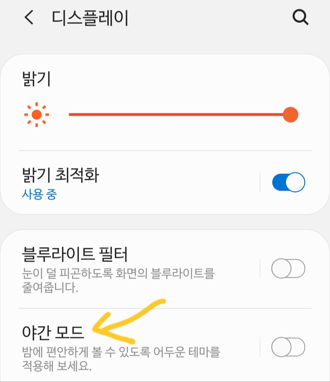 - 야간모드는 삼성폰 기본 설정에서는 안드로이드9 파이부터 지원. 오레오까지는 어두운 테마를 사용하면 거의 같은 효과 어차피 선탑재된 제조사앱만 적용되고, 각 앱에는 별개로 돌아가고 강제하지 않음. [본문으로]