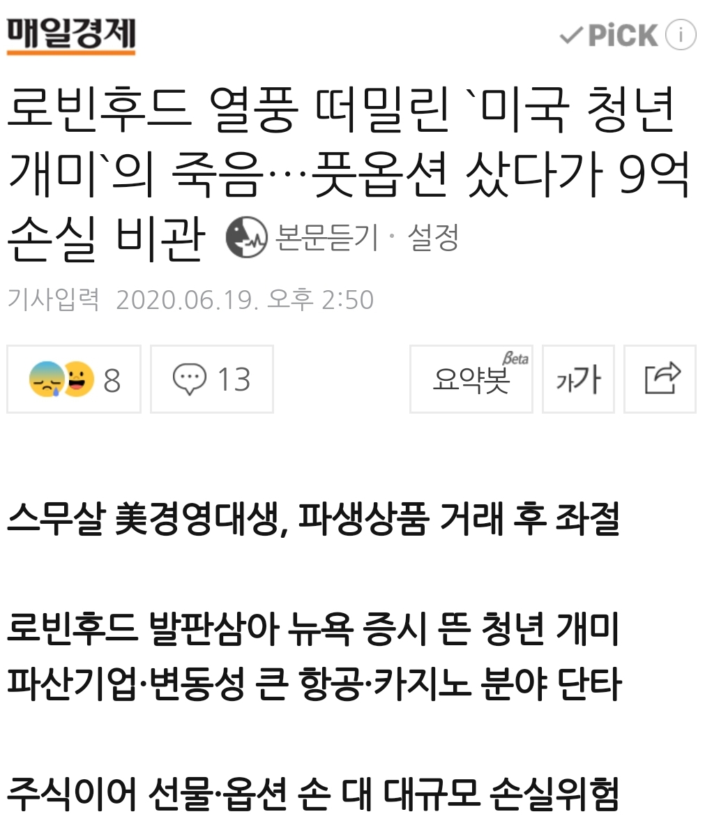 고인은 경영전공 2학년생이었다는데, 평소 주식 단타를 게임처럼 즐겼다고 합니다. 그러다, 파생상품에 손대 수십억 손실이 예상된다는 숫자가 화면에 뜨자 패닉, '현자타임'을 겪고 유서를 썼다고 합니다. 나같이 밑천없고 무지한 초보가 손쉽게 이런 거액을 거래할 수 있게 해서는 안된다고.