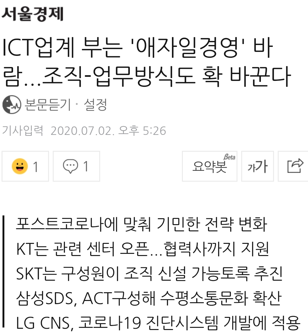 [서울경제] 시장변화에 즉각 대응하는 ‘애자일(Agile)’ 경영바람이 정보통신기술(ICT) 산업계에 불고 있다. 신종코로나바이러스감염증(코로나19) 사태로 급변하는 경제·사회적 지각변동에 맞춰