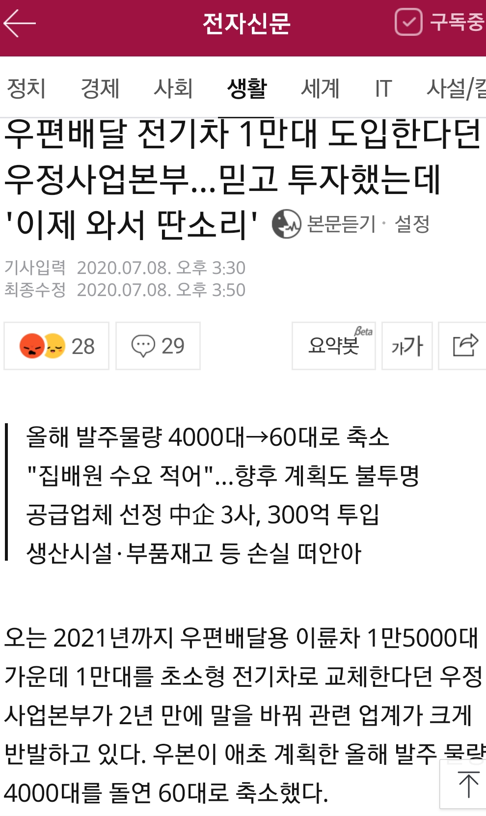 만약 우정사업본부의 우편과 택배물량이 줄 거라는 핑계가 사실이라면 그건 1만대 발주계획이 나오기 전에 알고 있었을 텐데요! 그런 건 몇 달이나 일 년 동안 바뀌는 추세가 아니니까요. 그래서 저건 그냥 핑계란 생각이 듭니다.2