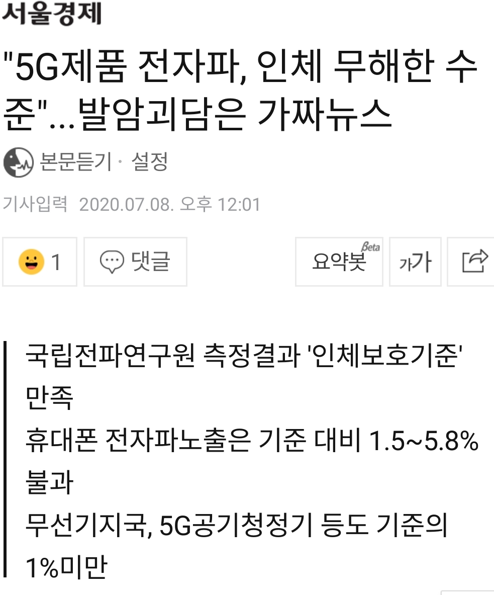 "5G 전자파 괴담은 근거없다"는 전파연구원 발표 본문
