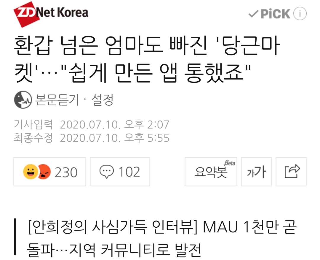 (지디넷코리아=안희정 기자)인터넷 쇼핑 심부름을 수도 없이 했던 기자가 아무런 도움 없이 '당근'하는 어머니를 봤을 때 '이건 되겠다'고 생각했다. 가입이 쉽고 직관적인 당근마켓 앱은 60대가