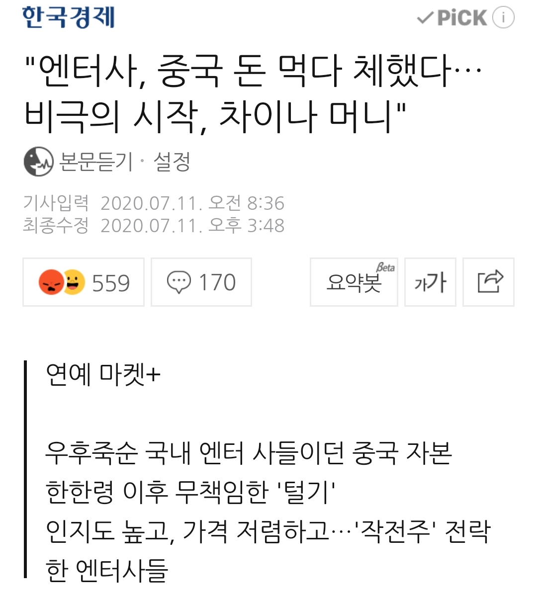 최근 몇 년 중국자본투자를 받은 일부(?) 엔터테인먼트회사들에 관한 기사 하나 본문