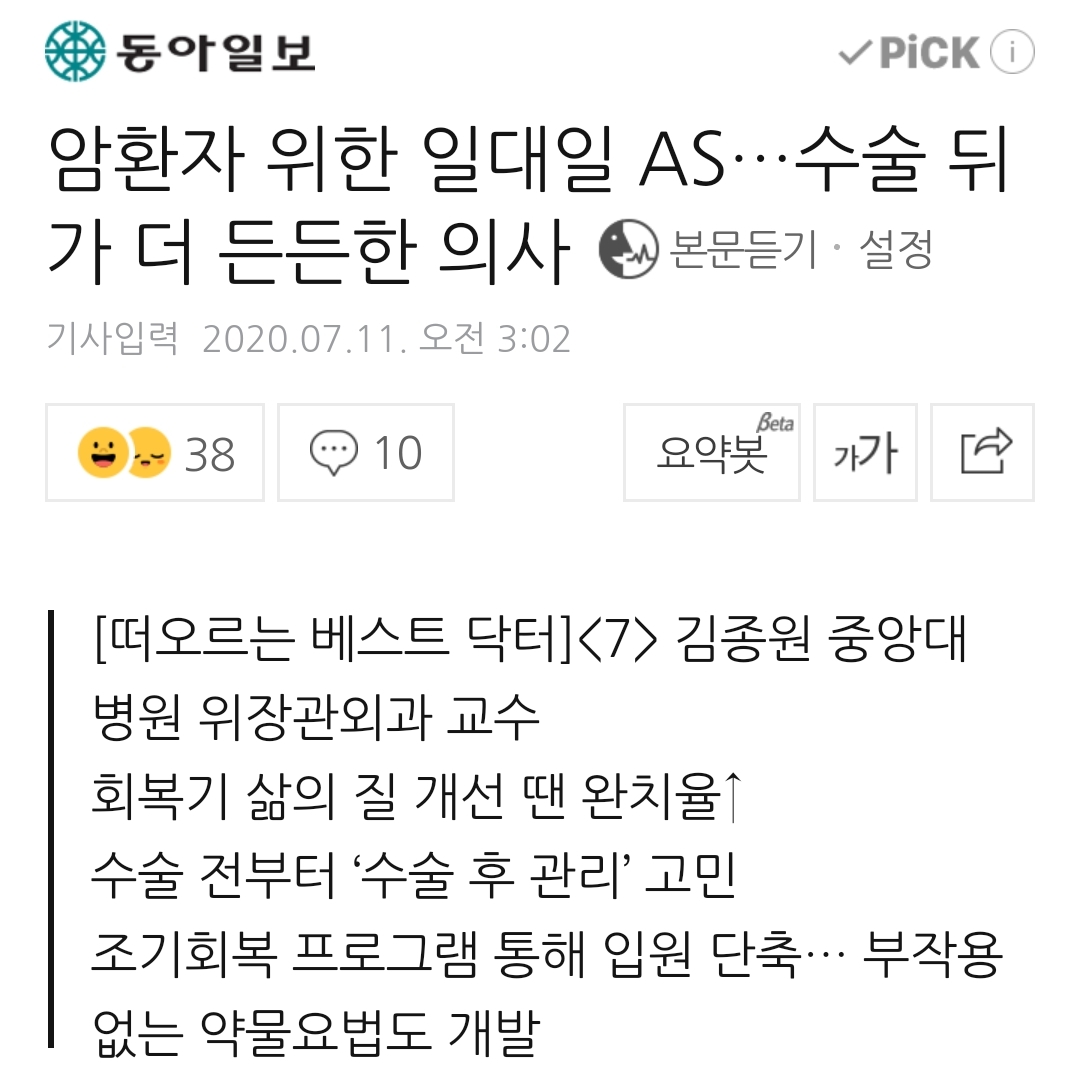 위암환자 수술과 의사. 신문기사 하나 본문