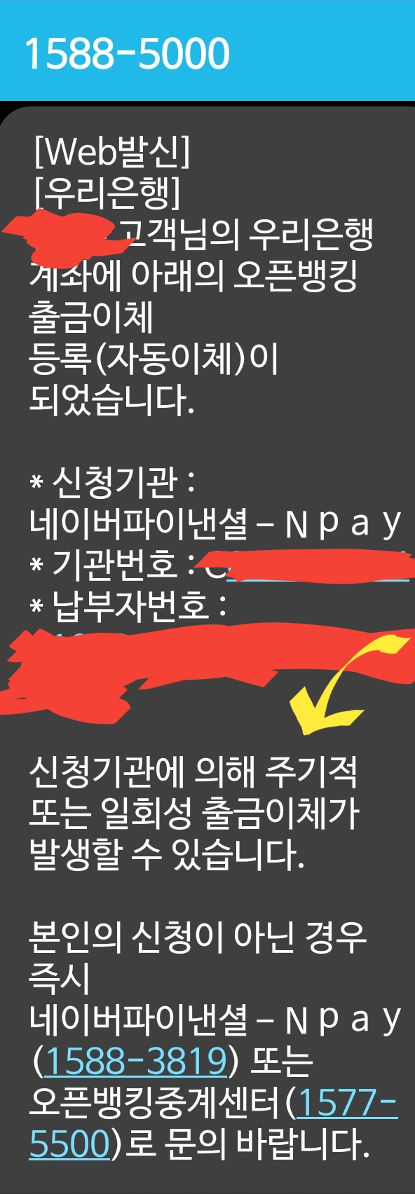 네이버페이(네이버통장말고)로 우리은행계좌이체충전하면, 오픈뱅킹 출금이체(자동이체)가 설정됐다고 우리은행에서 문자가 옵니다.