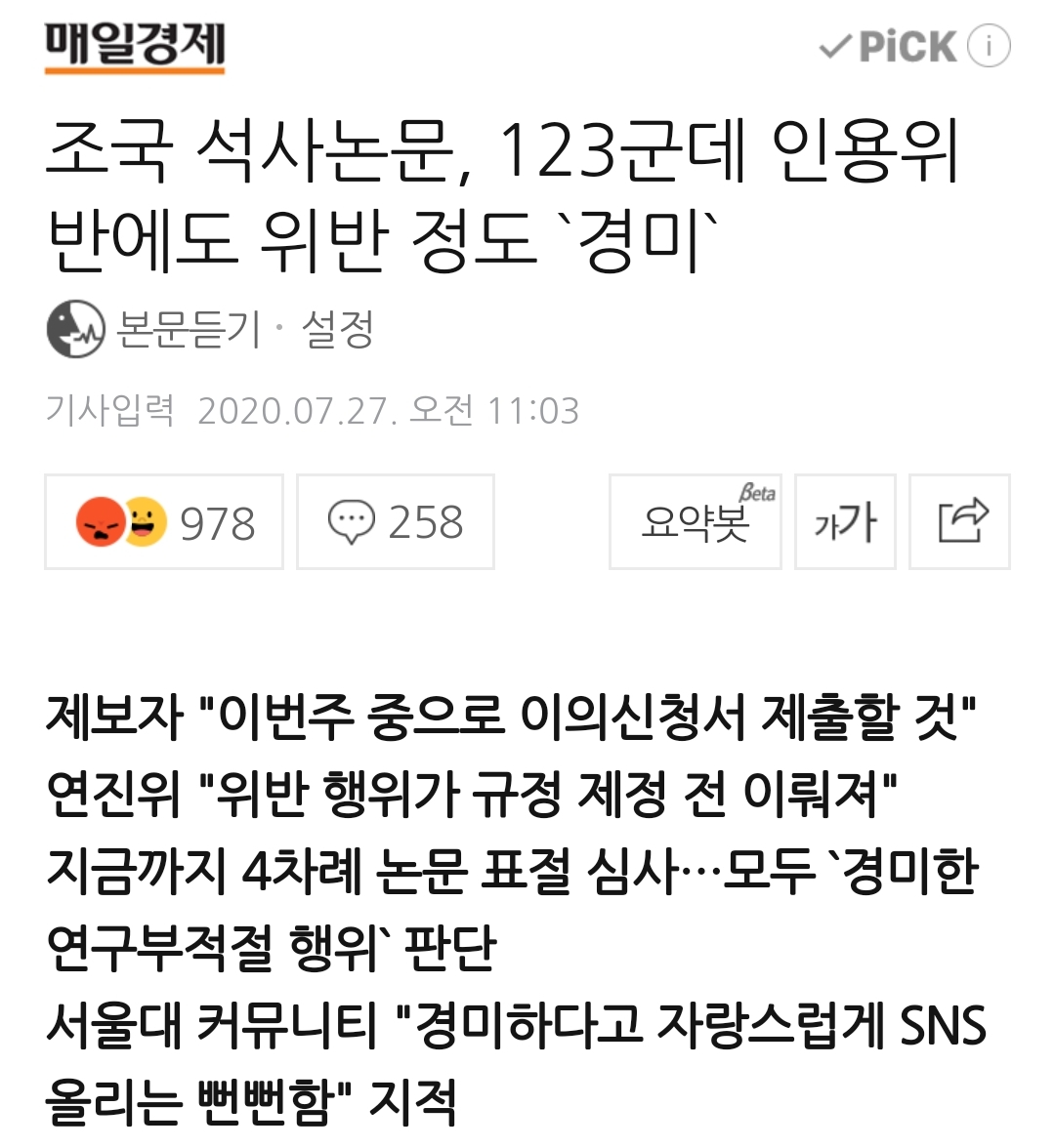 "그간 조 전 장관은 논문 표절 의혹을 수 차례 받아왔다. 앞서 조 전 장관은 2013년과 2015년 그리고 2018년 연진위의 판단을 받은 바 있다. 다만 그때마다 모두 '연구부적절행위'지만 그 정도는 '경미하다'는 결정이 내려졌다."