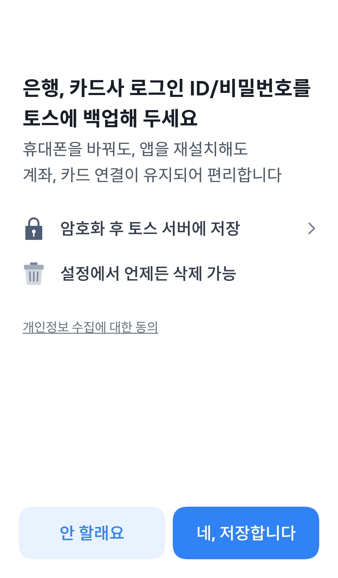 ※ 편의기능 중 하나로, 토스는 서버에 계좌연결정보를 저장하는 옵션이 있습니다. 그걸 끄면 새 전화기에 토스앱을 설치하면 과거 연결한 금융기관과 계좌이름은 보이지만, 상세정보와 계좌연결정보는 없는지 조회와 이체 사용은 수동으로 다시 연결해줘야 합니다. 선택은 자유.