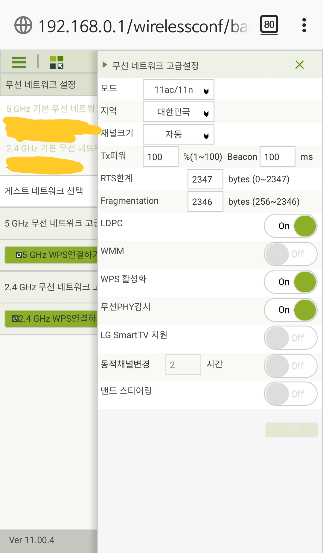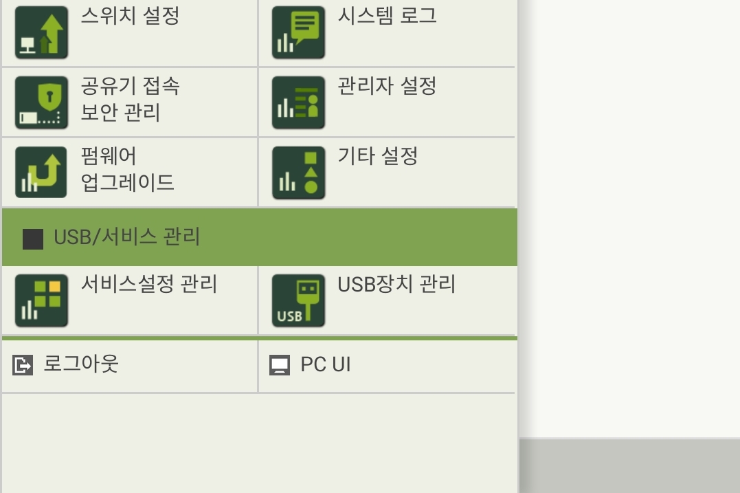 세부메뉴 화면입니다. 아래는 무선네츠워크 설정.