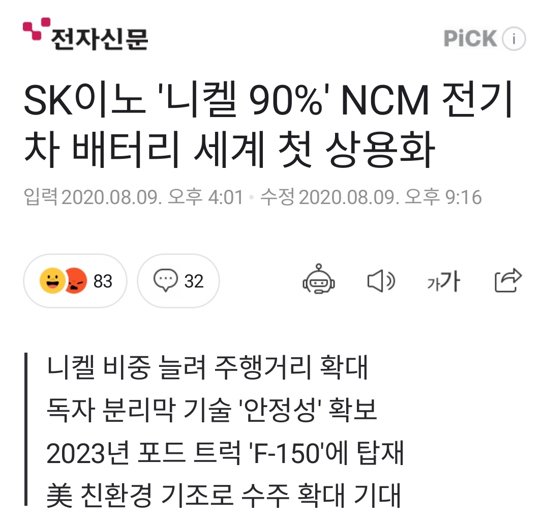 SK이노베이션이 니켈 함량을 90% 이상으로 높인 NCM(니켈·코발트·망간) 배터리를 세계 최초로 상용화한다. 이 회사는 2023년 'NCM구반반(9 ½ ½)' 배터리를 미국 포드의 인기 모델 'F-150' 전기픽업