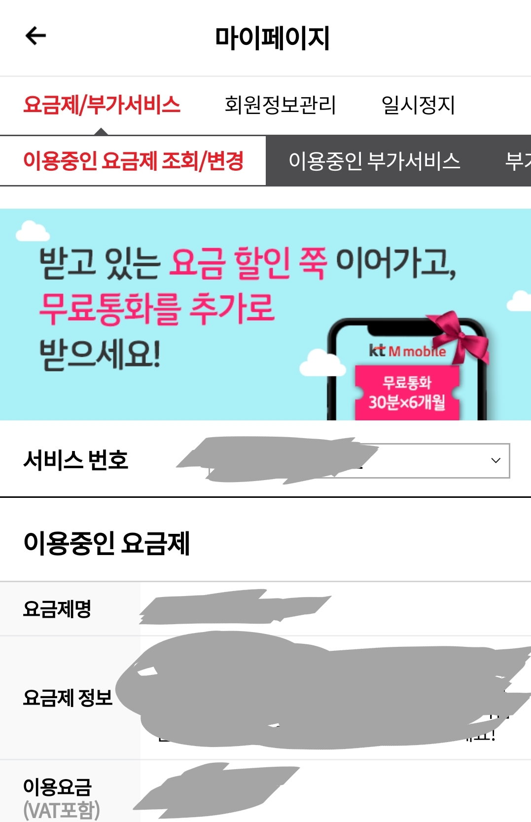 ※ 앱에서 "이용중인 요금제" 정보화면에는 할인적용하지 않은 기본요금기준으로 표시됩니다. 평생할인, 몇 개월 한정 추가할인 등은 "이용중인 부가서비스"화면의 상단에 표시됩니다.