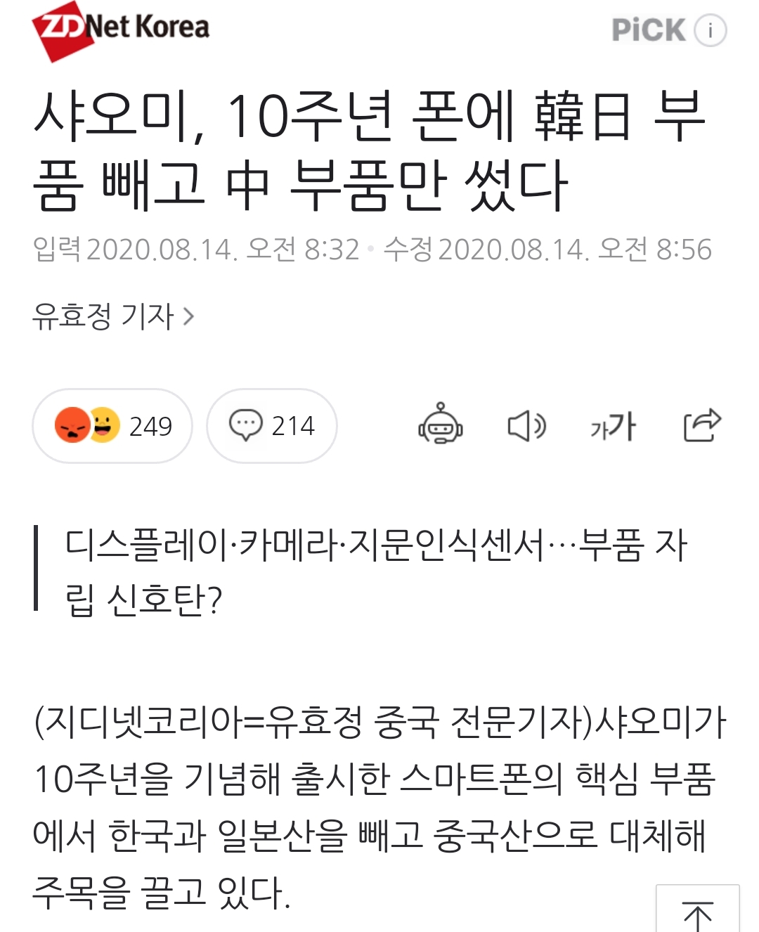 (지디넷코리아=유효정 중국 전문기자)샤오미가 10주년을 기념해 출시한 스마트폰의 핵심 부품에서 한국과 일본산을 빼고 중국산으로 대체해 주목을 끌고 있다. 중국산 프리미엄 폰의 부품 자립