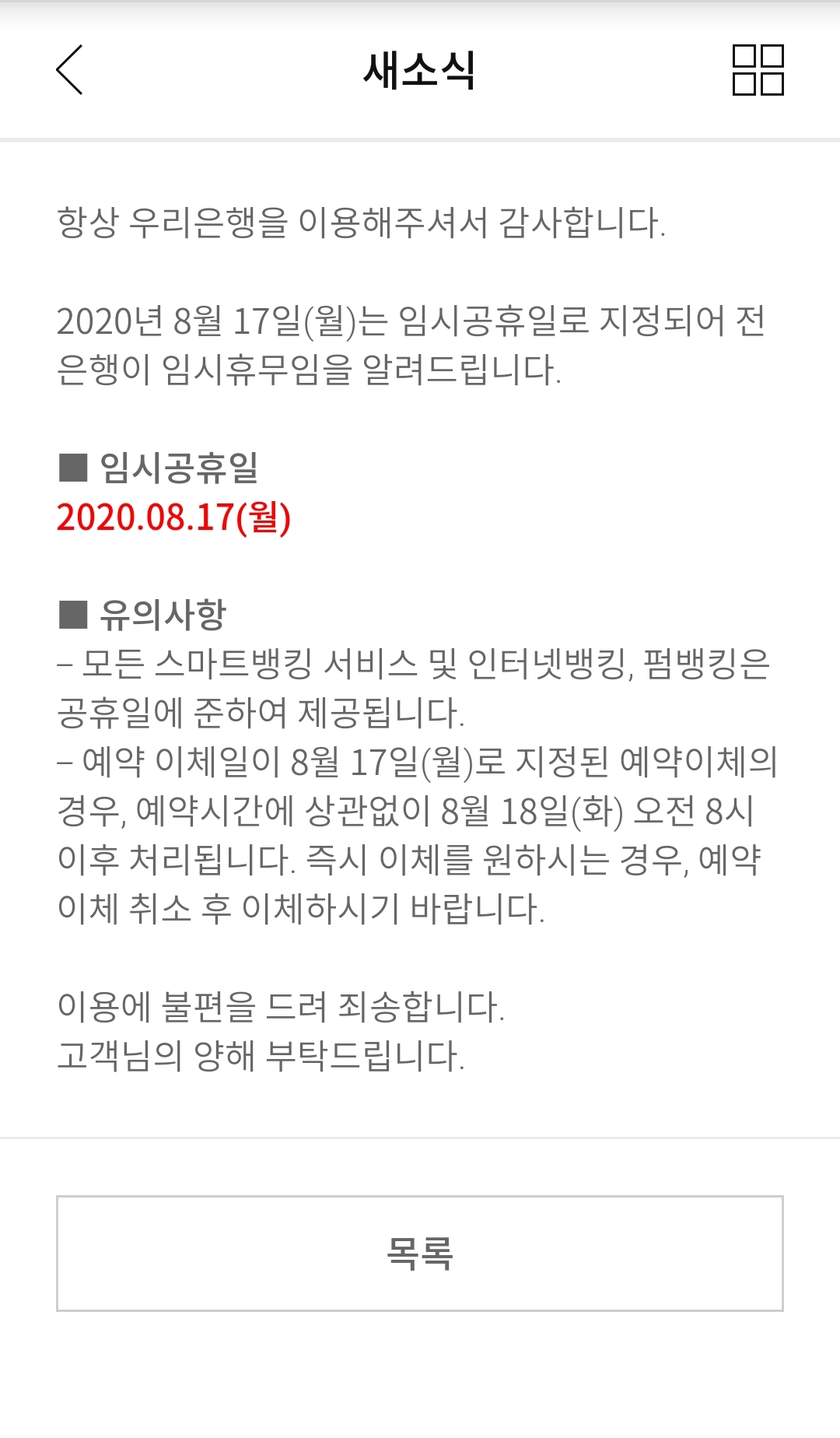 은행 임시공휴일 자동이체 처리기준 본문