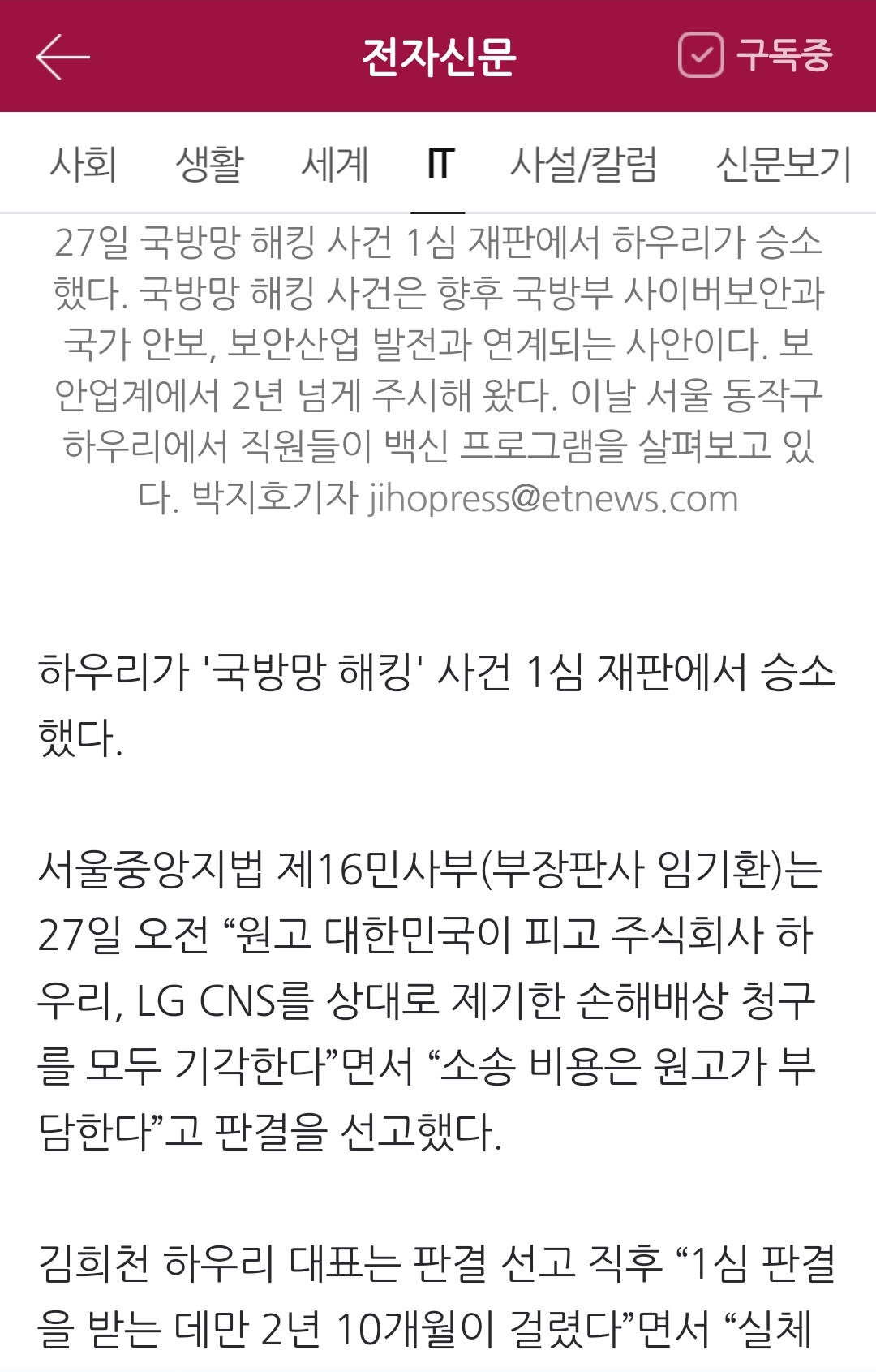 대한민국정부(국방부)가 패소했습니다. 전자신문 기사입니다.