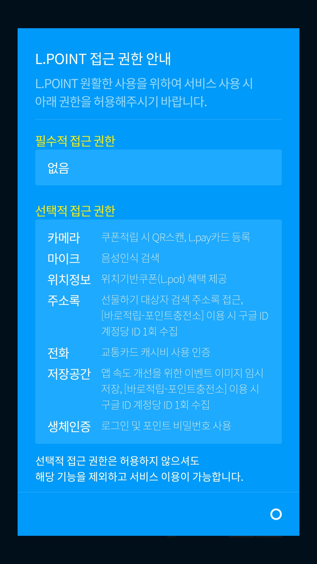 "선택적 접근 권한은 허용하지 않으셔도 해당 기능을 제외하고 서비스 이용이 가능합니다"