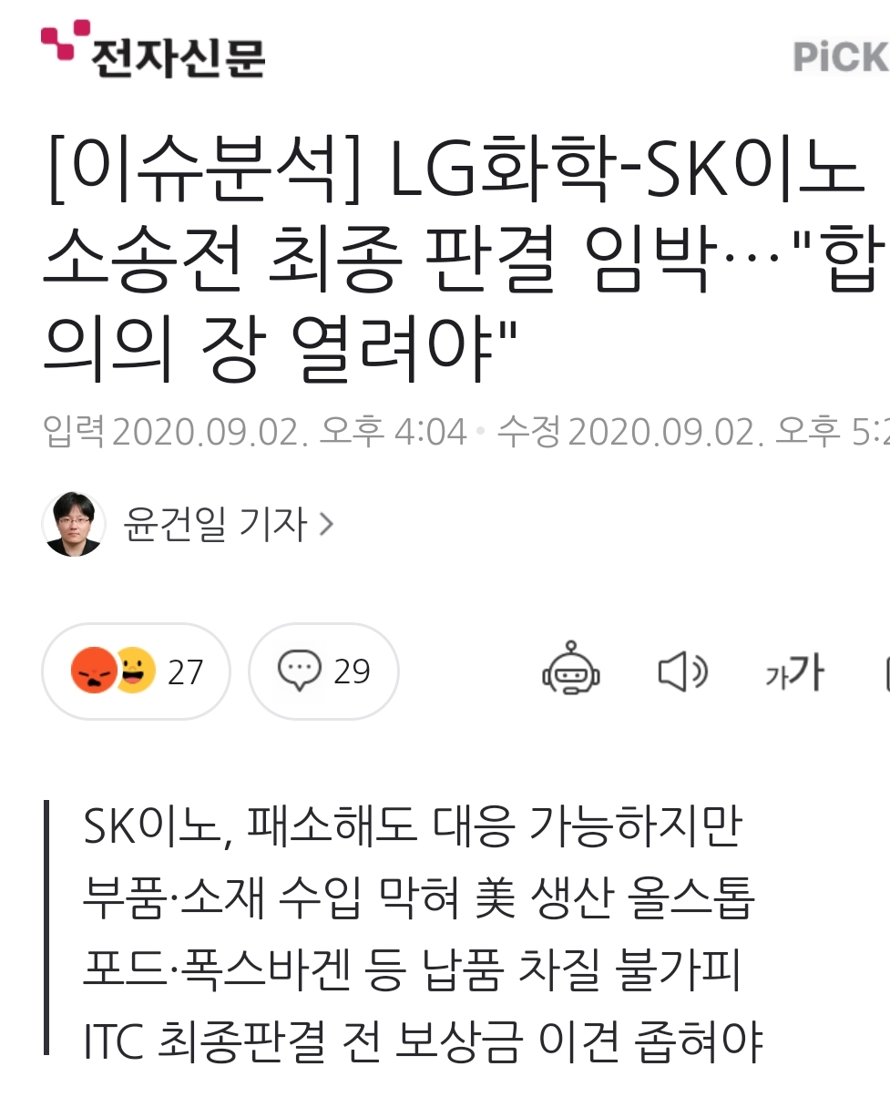 ㅡ《 SK이노베이션과 LG화학은 ITC 조기패소 판결 후 분쟁을 해결하기 위한 협상을 진행한 것으로 알려졌다. (......) “미국 ITC 판결이 얼마 남지 않았기 때문에 그 이전에 움직인 것”》전자신문 기사.