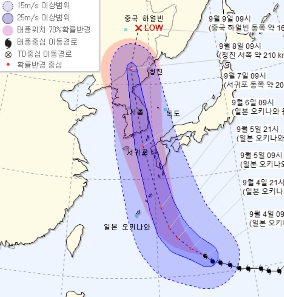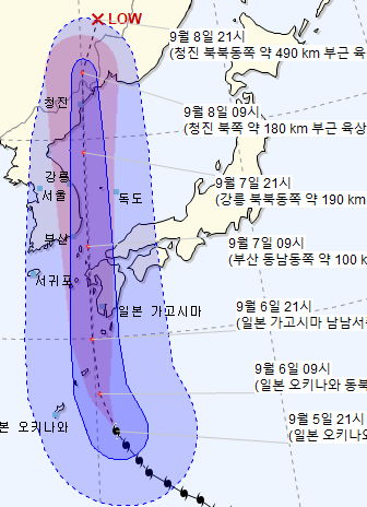 9월 7일에서 8일 사이에 대한민국을 제주부터 강원도까지 쓸고 백두산으로 갈 거라 하네요. 삼일예보의 범위 밖이라 강수량 예측은 아직 날씨앱에 나오지 않았습니다.