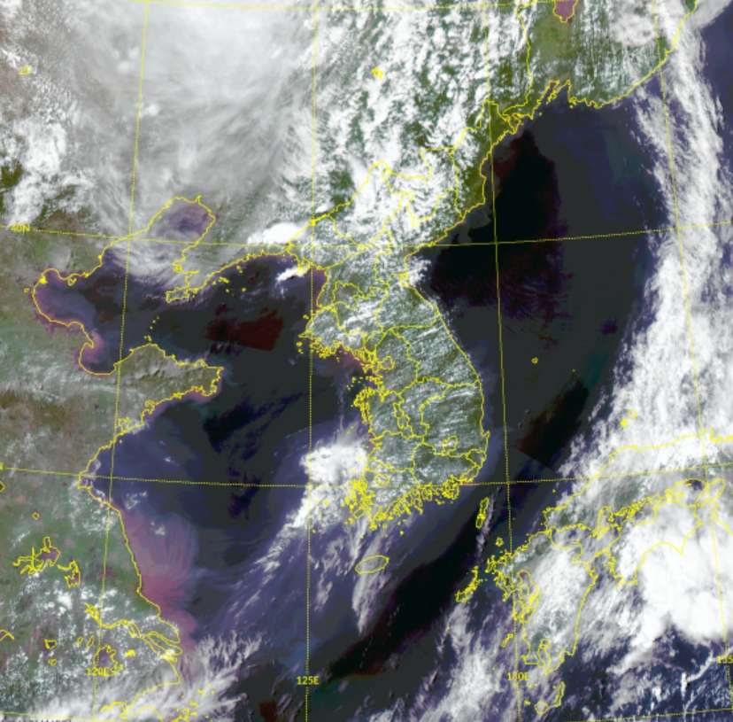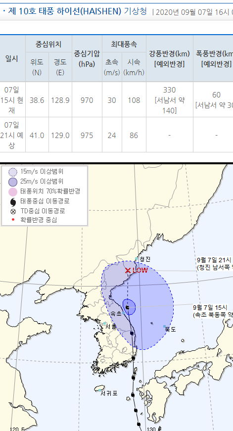 지금은 원산앞바다쯤 가 있고, 오늘 저녁쯤 북한지역의 단천-김책 언저리에서 다시 상륙한 다음 저기압으로 바뀔 것이라는 예보.