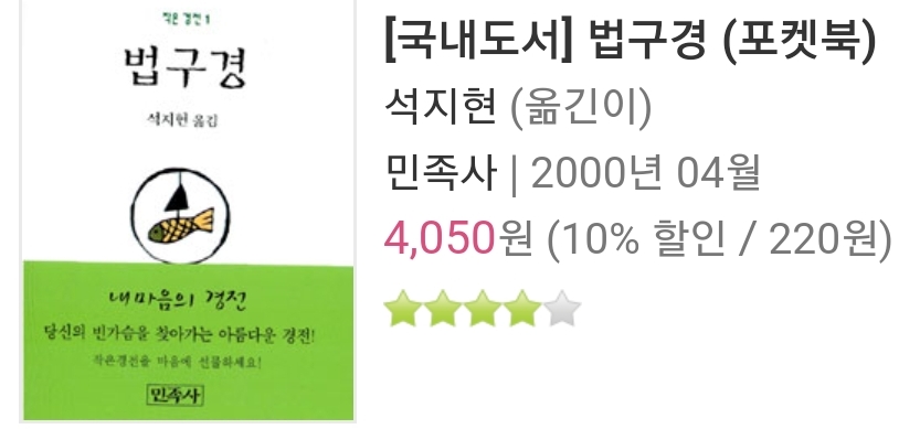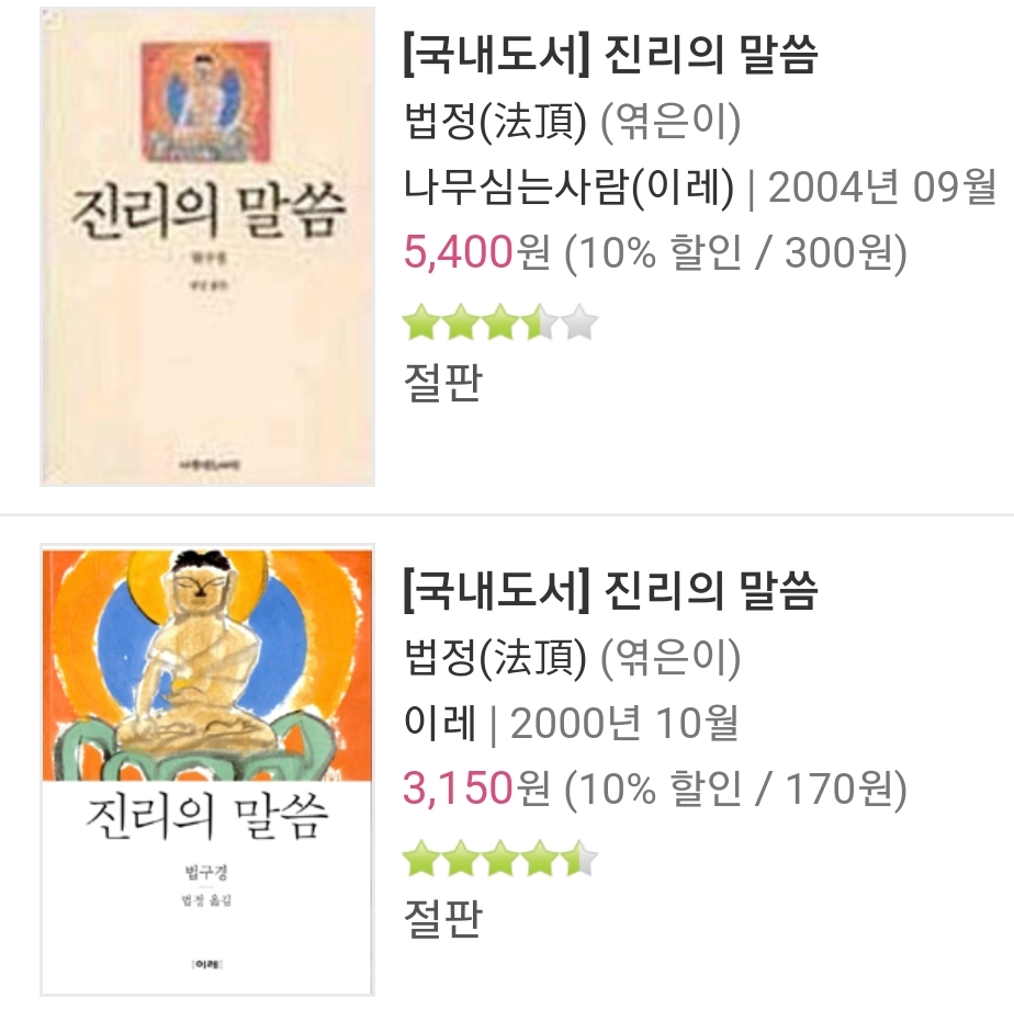 제가 좋아하는 책은 법정스님판. 불교용품거리에서 처음 사봤거든요. 저희집은 교는 별로 배척하지도 독실하지도 않고 다 접해봐서1.. 어머니께서 백에 넣어다니셨는데 일터에서 잃어버린 - 누군가에게 공양한 - 뒤에 새 책을 사드리려 보니, 저자가 타계하며 글을 남기지 말라 해서 절판.. 중고로 구할 수 있었던 글씨큰 큰 책을 사드렸는데 휴대하기 불편하니 집에 두시더군요. 작은 책은 국제기드온협회가 뿌리는 포켓 신약성경보다 조금 큰 정도라서 휴대하기 좋았는데.