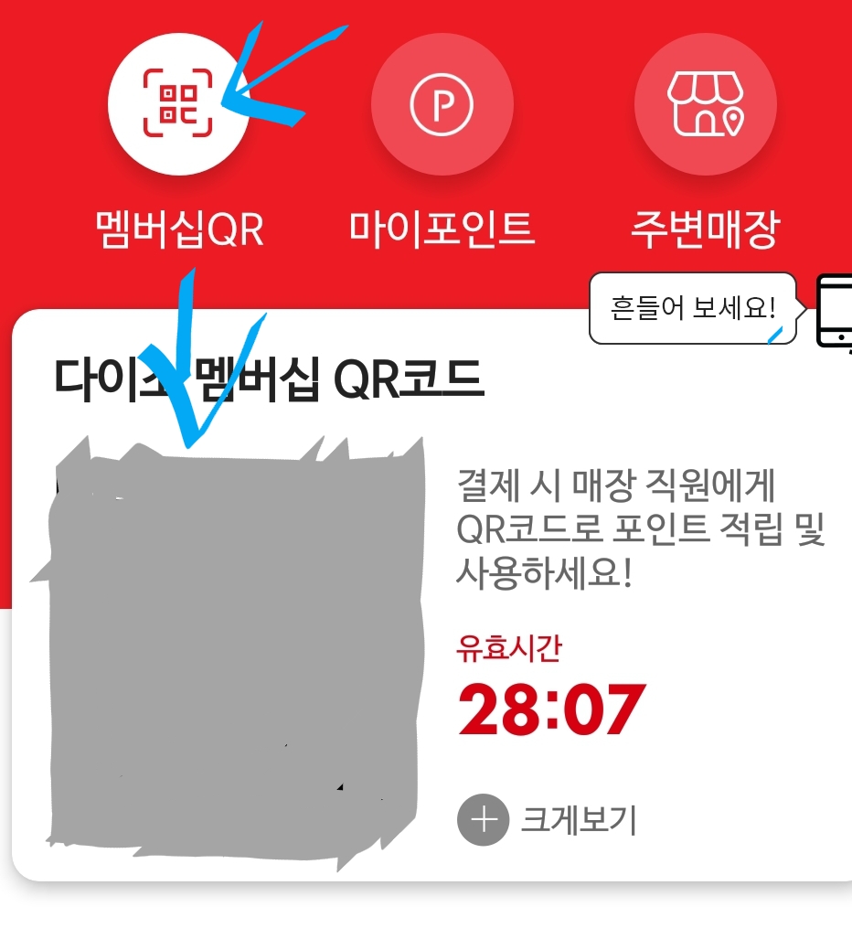 QR코드가 나오는데, 일단 앱으로 가입했으면 폰꺼낼 필요없이 그냥 전화번호로 적립됩니다.