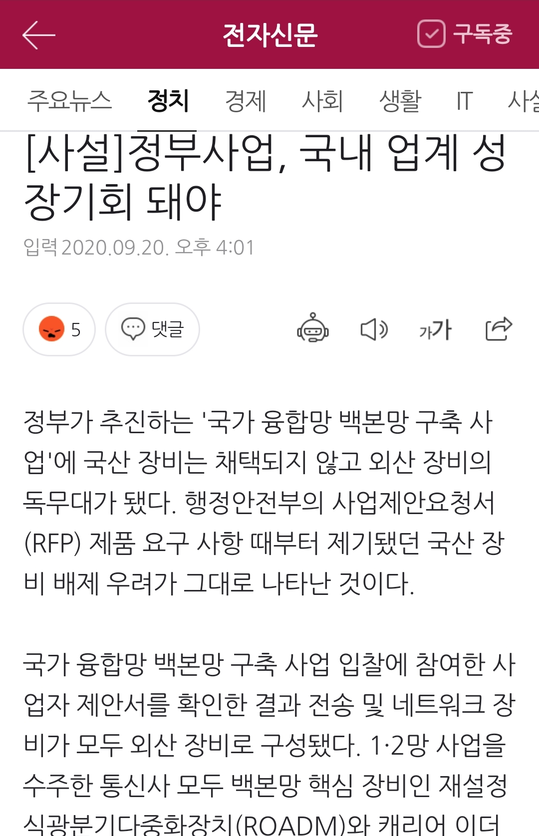 전자신문, 국내 통신망 장비업계에 기회를 주라는 기사 본문