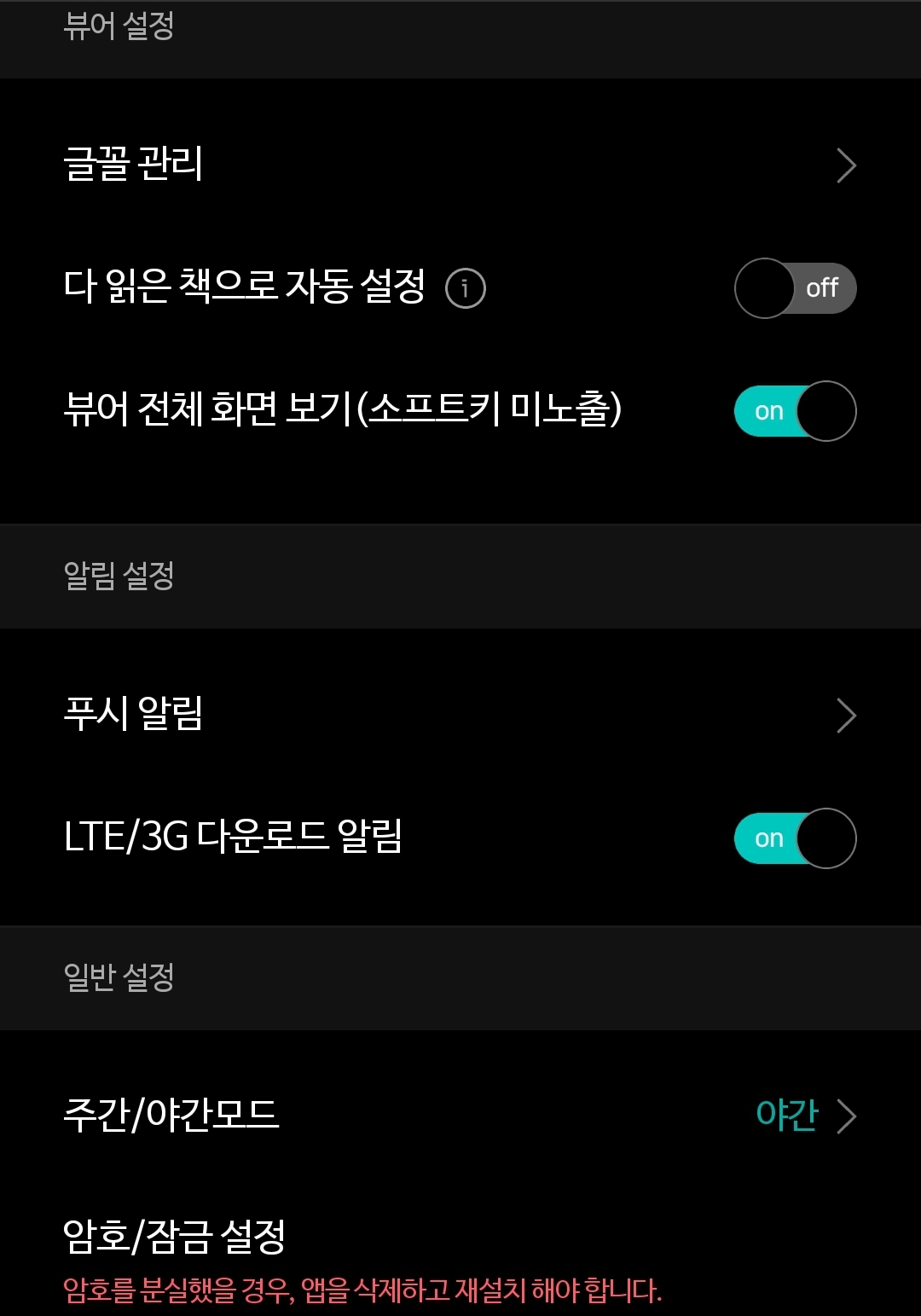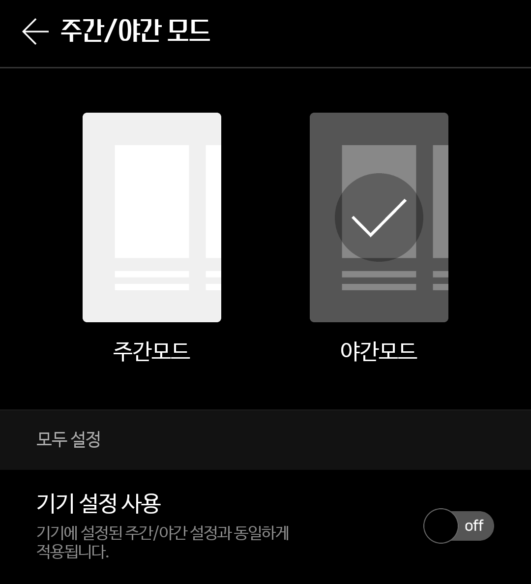 야간모드가 생겼습니다. 본문은 따로 지정하지 않았으면 본문스타일 정해준 대로 따라가지만, 목록화면은 이걸로 정해줍니다.