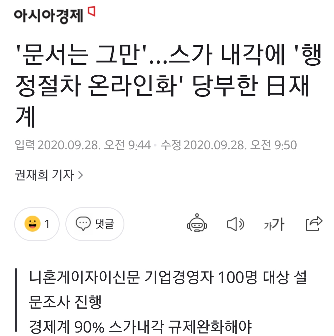 [아시아경제 권재희 기자] 일본 경제계가 새로 출범한 스가 요시히데 총리 내각에 규제완화를 요구하는 목소리가 높은 가운데 '행정절차의 온라인화'를 최우선 과제로 꼽았다. 신속한 사업집행�
