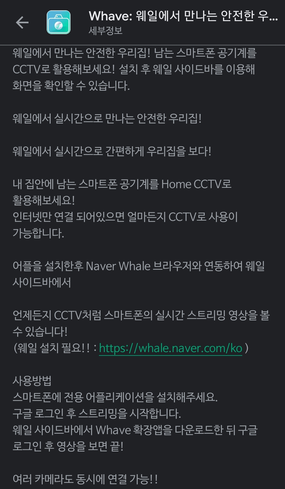 빈집보기, 혼자 있는 반려동물 관찰하기 등에 쓸 수 있다고 합니다. 뷰어는 자기 컴퓨터에 깔아둔 웨일브라우저라는 듯. 웨일 사이드바에서 넣어달라는데, 안드로이드폰용 웨일 브라우저에는 사이드바가 없네요.