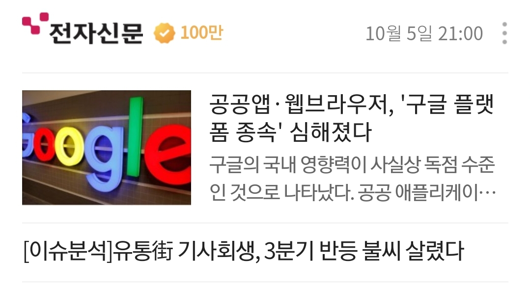구글의 국내 영향력이 사실상 독점 수준인 것으로 나타났다. 공공 애플리케이션(앱)의 98%가 구글을 통해 유통되고 있다. 모바일·PC 웹 브라우저에는 점유율 50%가 넘었다. 구글은 최근 자사 결제�