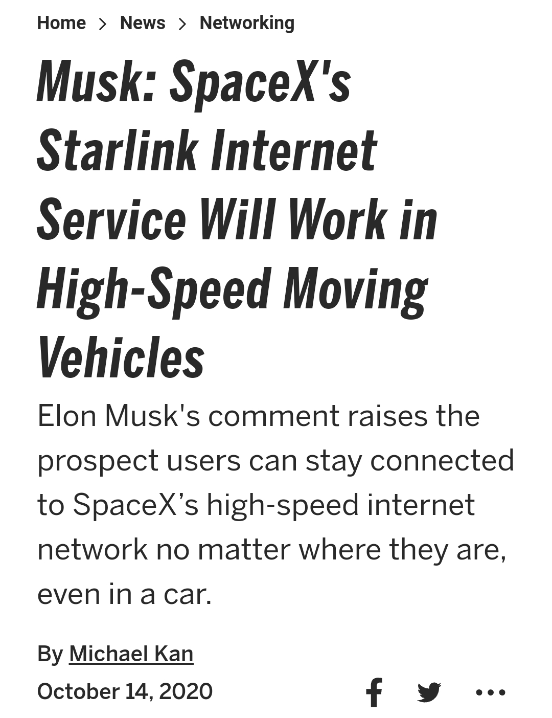 Musk: SpaceX's Starlink Internet Service Will Work in High-Speed Moving Vehicles