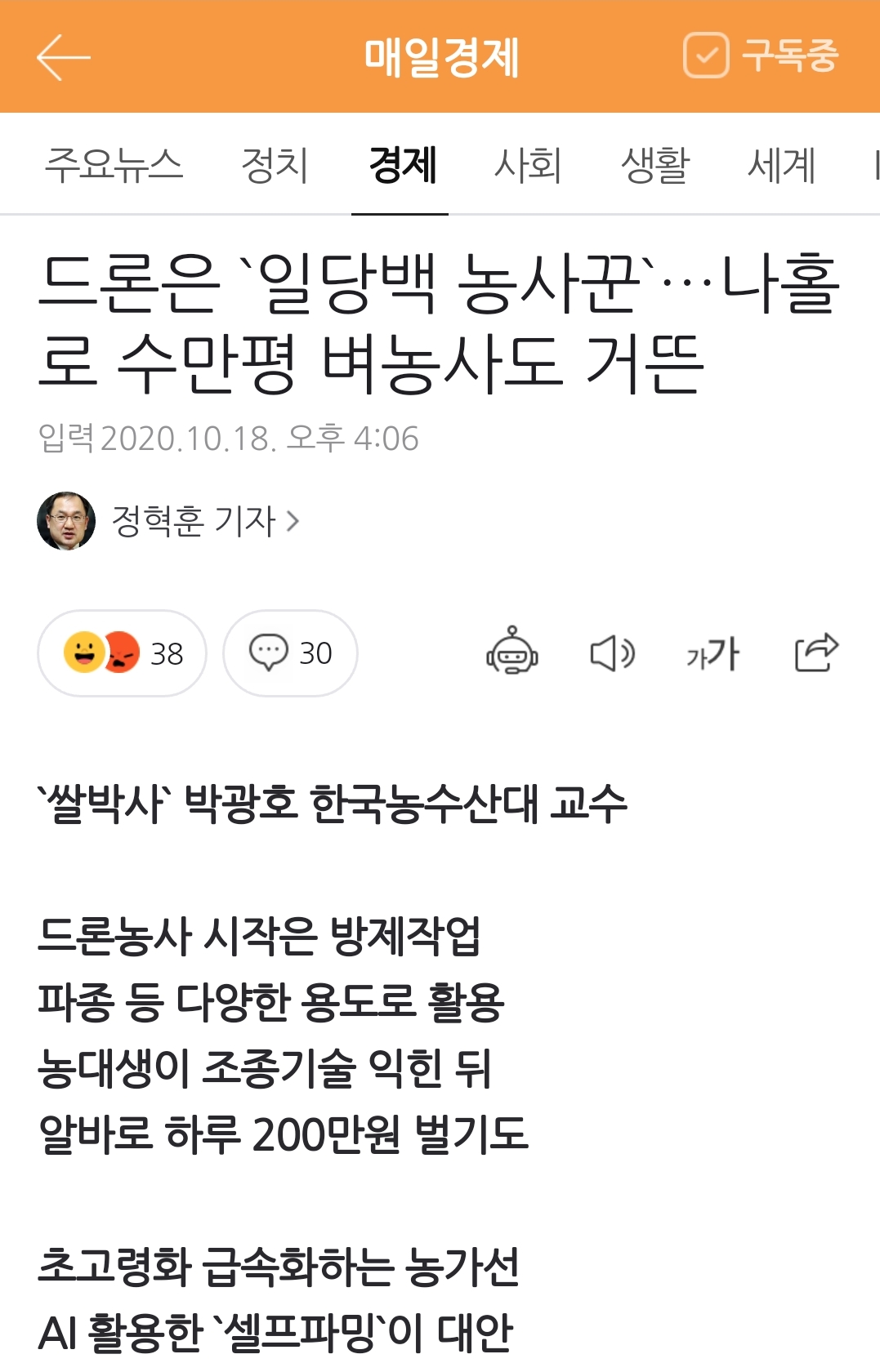 `쌀박사` 박광호 한국농수산대 교수 드론농사 시작은 방제작업 파종 등 다양한 용도로 활용 농대생이 조종기술 익힌 뒤 알바로 하루 200만원 벌기도 초고령화 급속화하는 농가선 AI 활용한 `셀프�