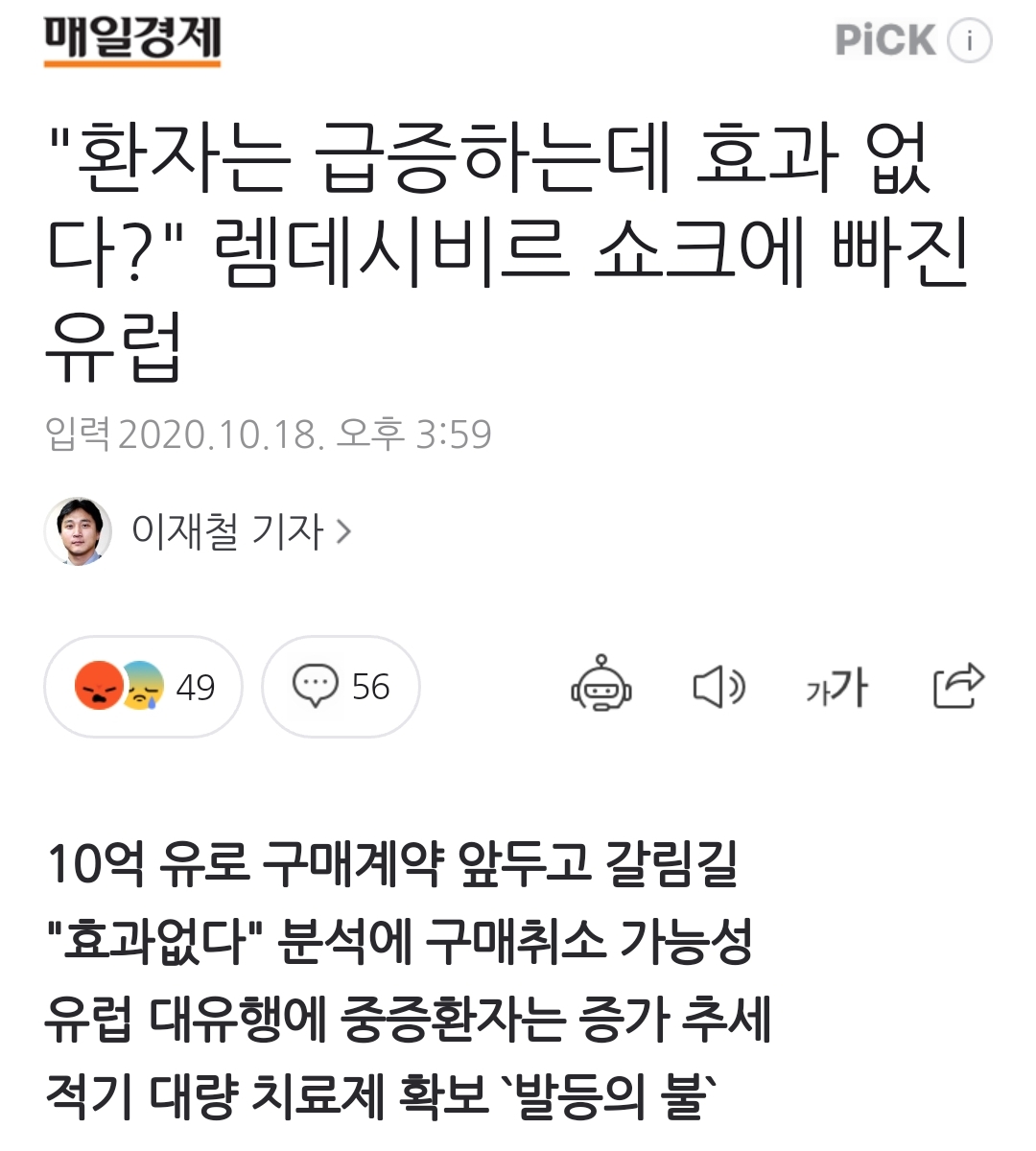 10억 유로 구매계약 앞두고 갈림길 "효과없다" 분석에 구매취소 가능성 유럽 대유행에 중증환자는 증가 추세 적기 대량 치료제 확보 `발등의 불` 코로나19 중증환자에 치료에 '렘데시비르'가 효과