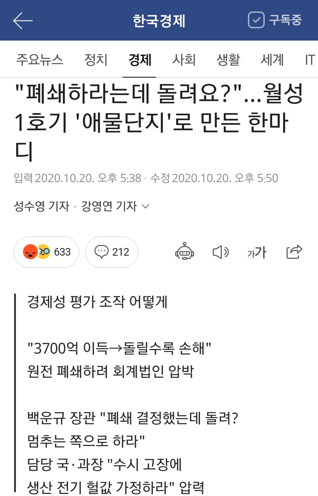 “월성 1호기 조기 폐쇄가 결정돼 있는데 원전을 계속 돌리는 게 말이 돼요? 청와대에 그렇게 보고 못 합니다. 즉시 가동을 멈추는 쪽으로 재검토하세요.” 정부의 월성 원전 1호기 조기 폐쇄 결