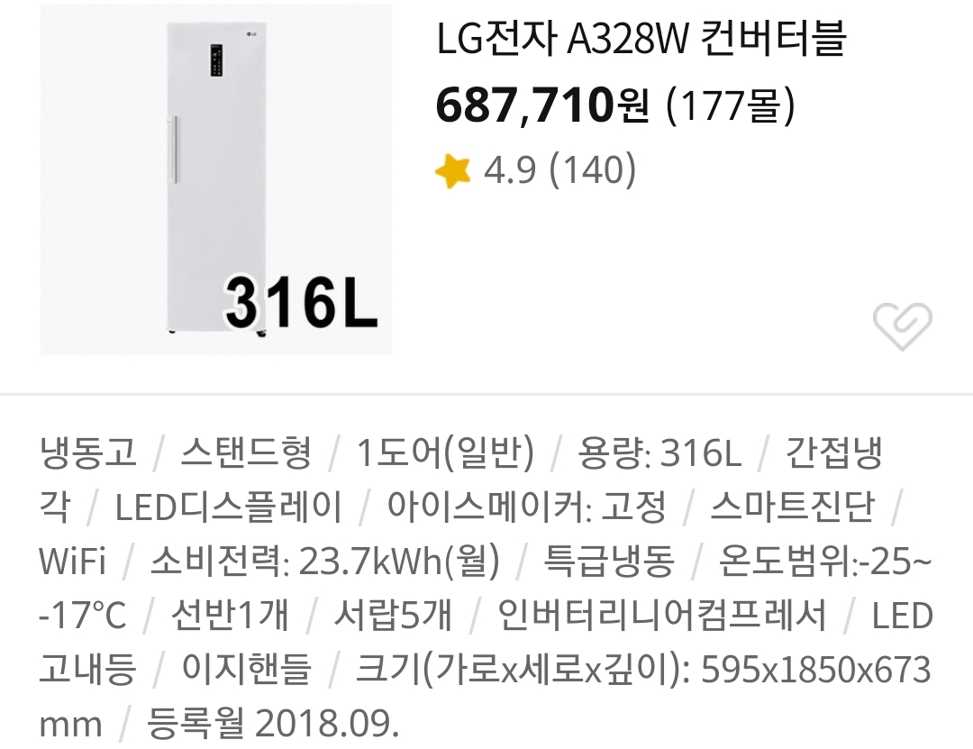 스탠드형은 바닥공간절약과 인테리어상 이점은 좋지만 나머지가 좀 애매하다. 300리터급 냉동실은 800리터급 양문형 냉장고의 냉동실 용적이다. 저 300리터급 냉동고의 부피는 높이는 일반냉장고고 깊이는 양문형 600리터급쯤으로 슬림해 빌트인에 어울릴 것 같이 보인다. 가로는 애매하다. 그리고 가격대는 600리터급 양문형냉장고 중 마이너브랜드 세일할 때 정도? 그래서 스탠드형냉동고를 애드온 개념으로 추가구비하자면 어중간한 느낌이다.