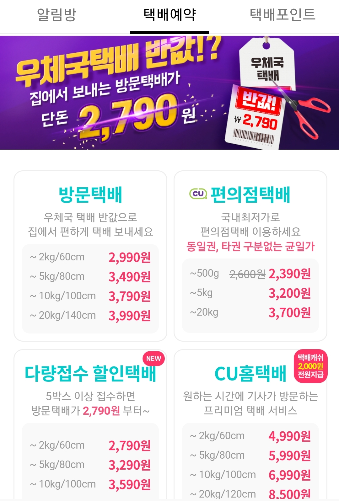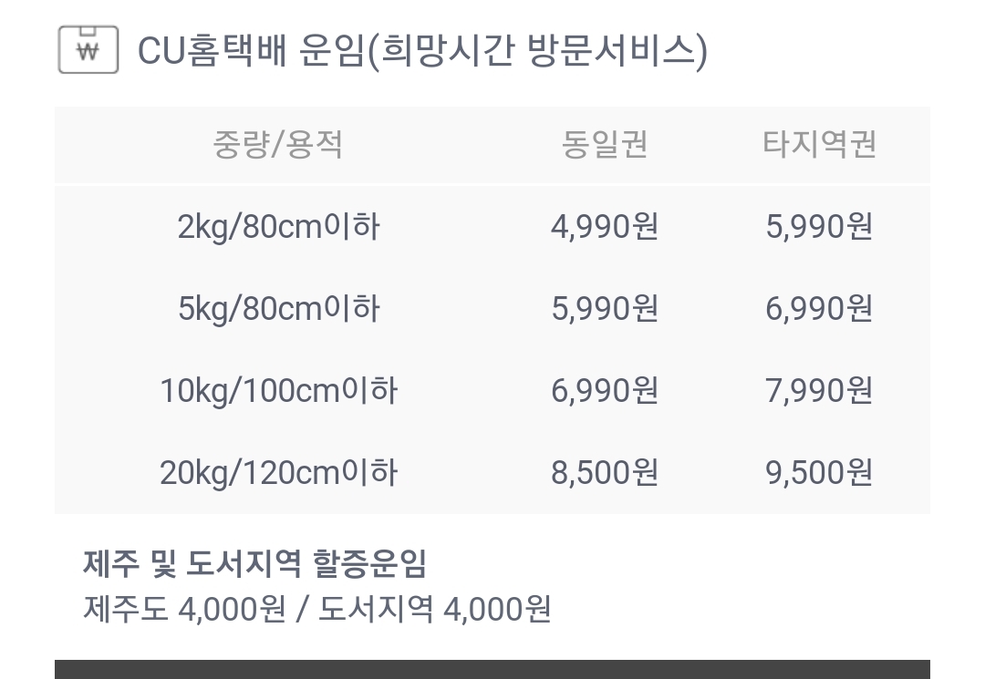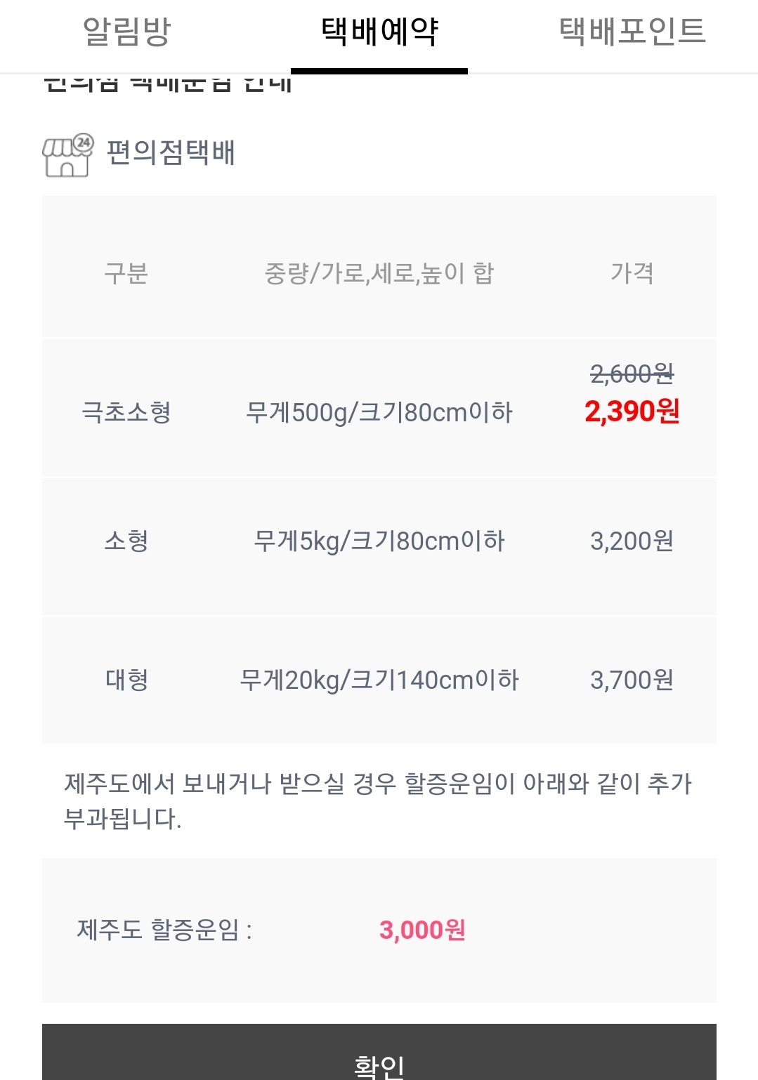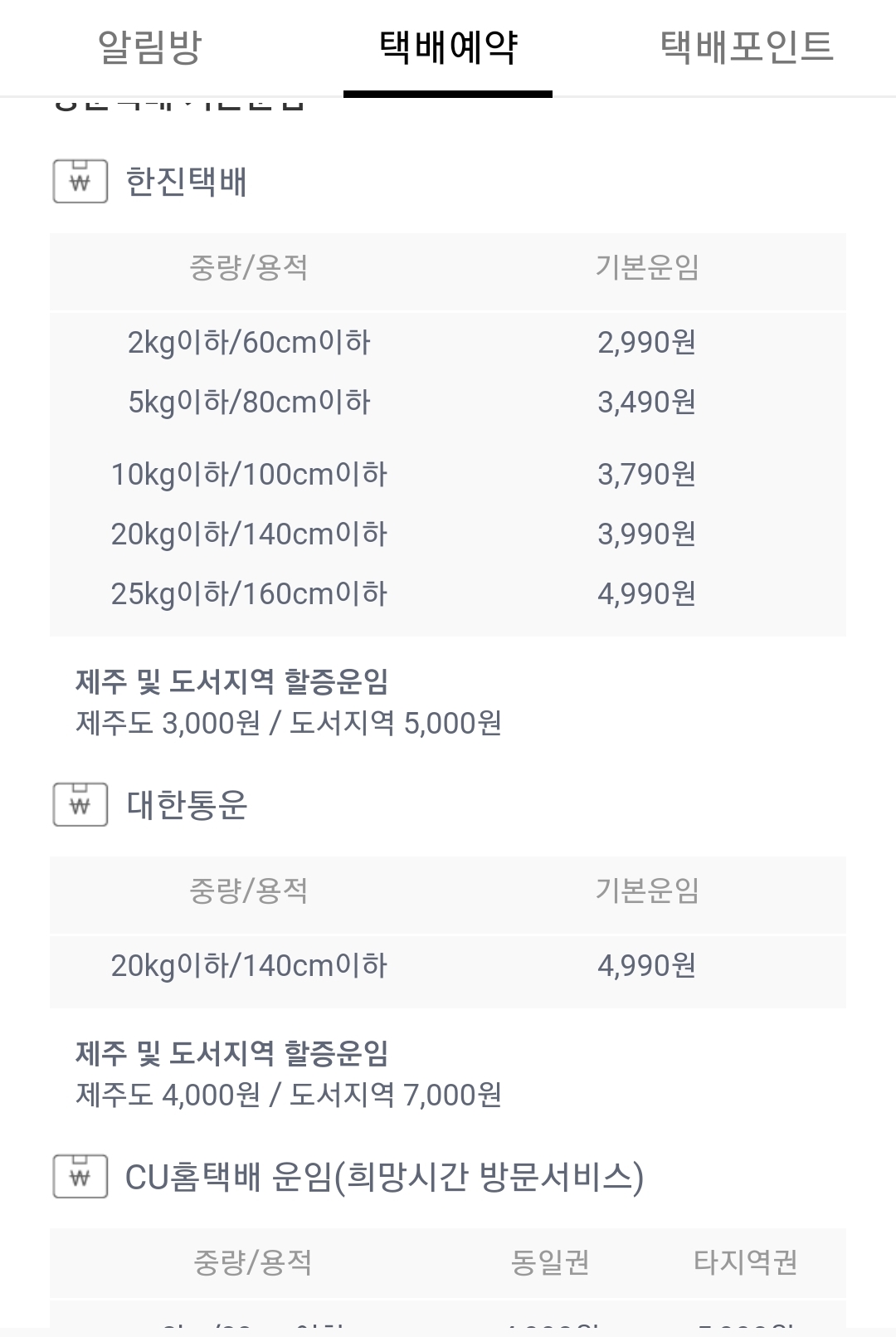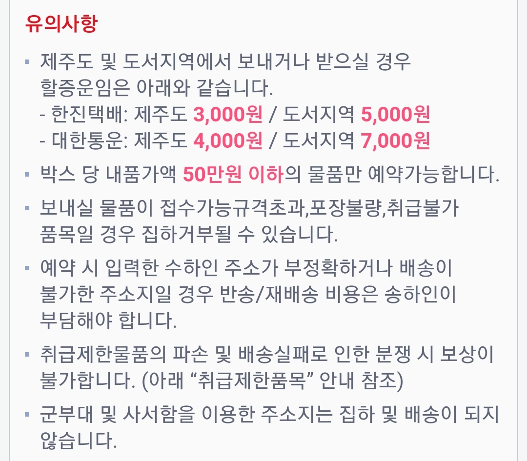 일단 이 앱에서 예약받는 택배는 제주/도서/벽지 할증요금이 있다. 그거 안 내거나 적게 내는 서비스는 우체국선편이나 농협 등 다른 데서 찾아볼 것.