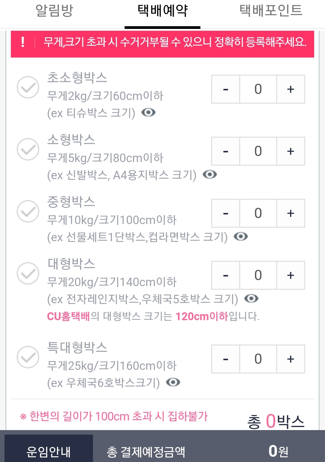우체국택배기준 화면. 좀 잘 모르겠는 부분도 있다. 결제까지는 안해봤음.