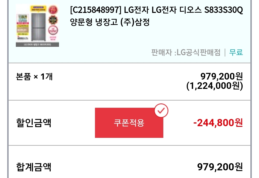 (딜) LG전자 디오스 S833S30Q 양문형 냉장고 본문